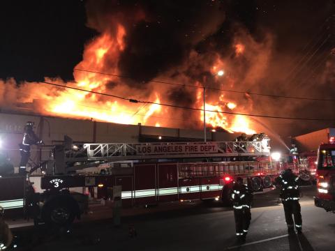 The Los Angeles Fire Department was notified at 6:43 PM on October 14, 2017 of a fire at French Fabric, Inc. located at 1621 S. Soto Street in Boyle Heights. Firefighters quickly arrived to find fire both outside and inside the large commercial building and engaged in an intense battle before flames stretched through the roof and structural compromise forced defensive operations. Nearby businesses were exposed to heavy heat and fire that crews were able to fight back and stop from continuing to spread.